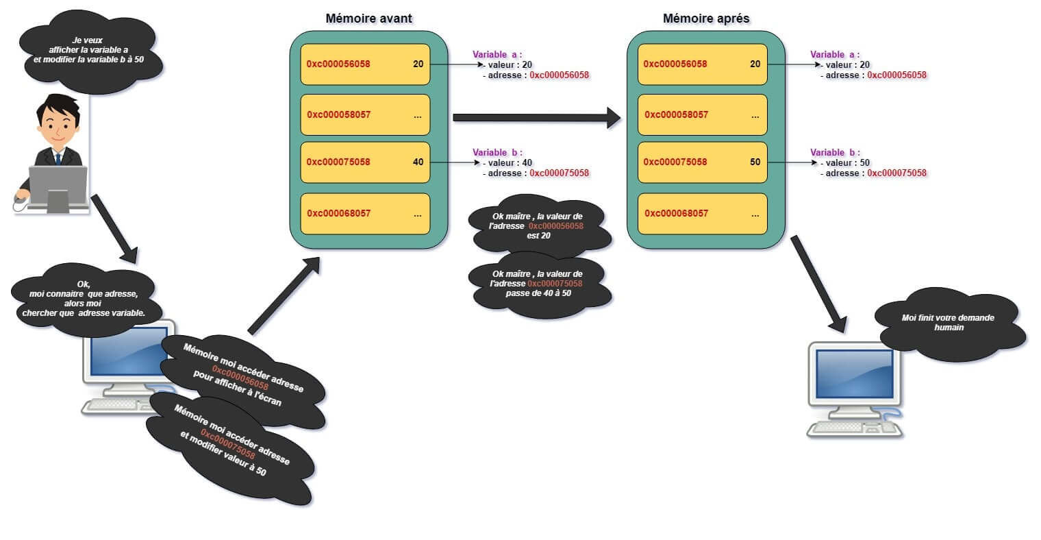 Ça fonctionne comme à la poste, le facteur a besoin de connaître votre adresse pour vous livrer votre colis. C'est la même chose pour votre machine, elle a besoin de connaître l'adresse de votre variable pour la manipuler.